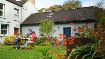 Two women eating breakfast outdoors in a cottage garden in Ireland, surrounded by flowers and greenery. Two women eating breakfast outdoors in a cottage garden in Ireland, surrounded by flowers and greenery.